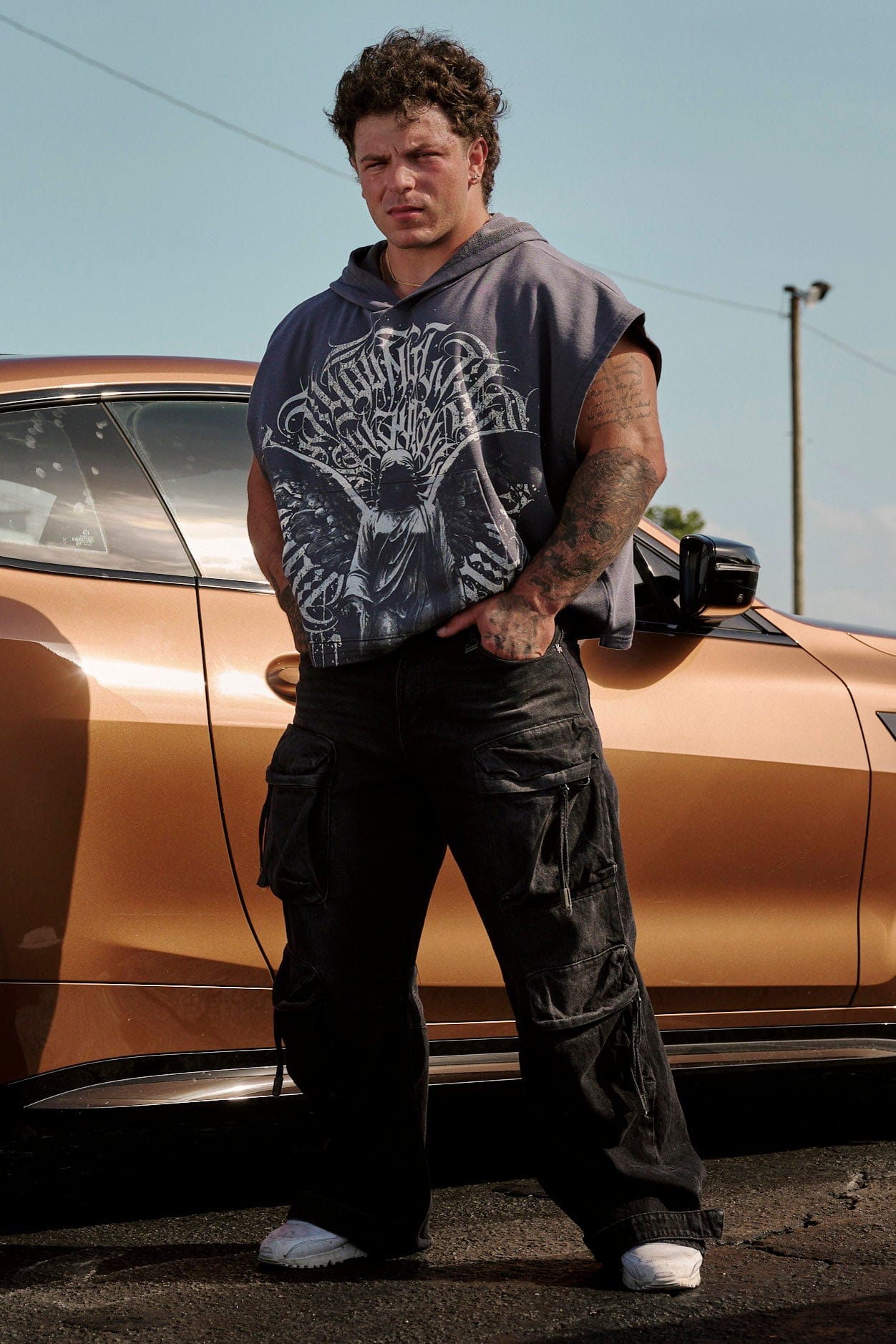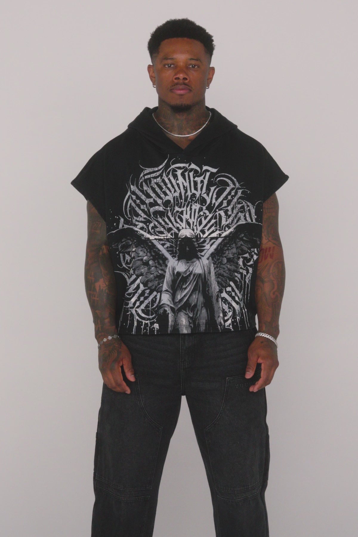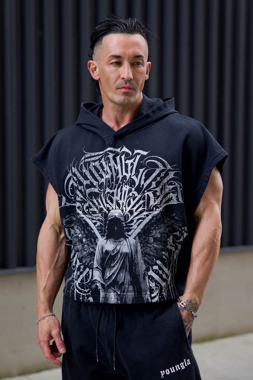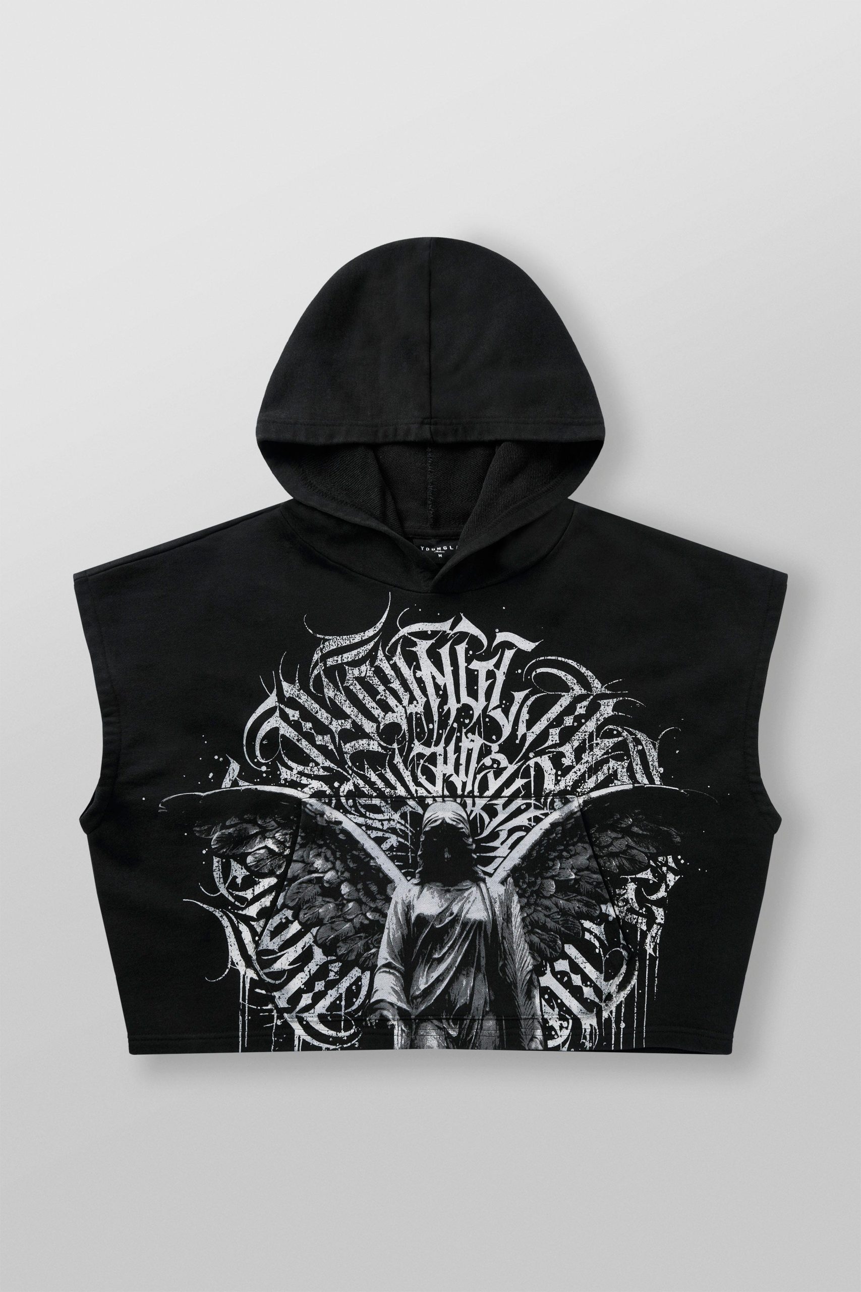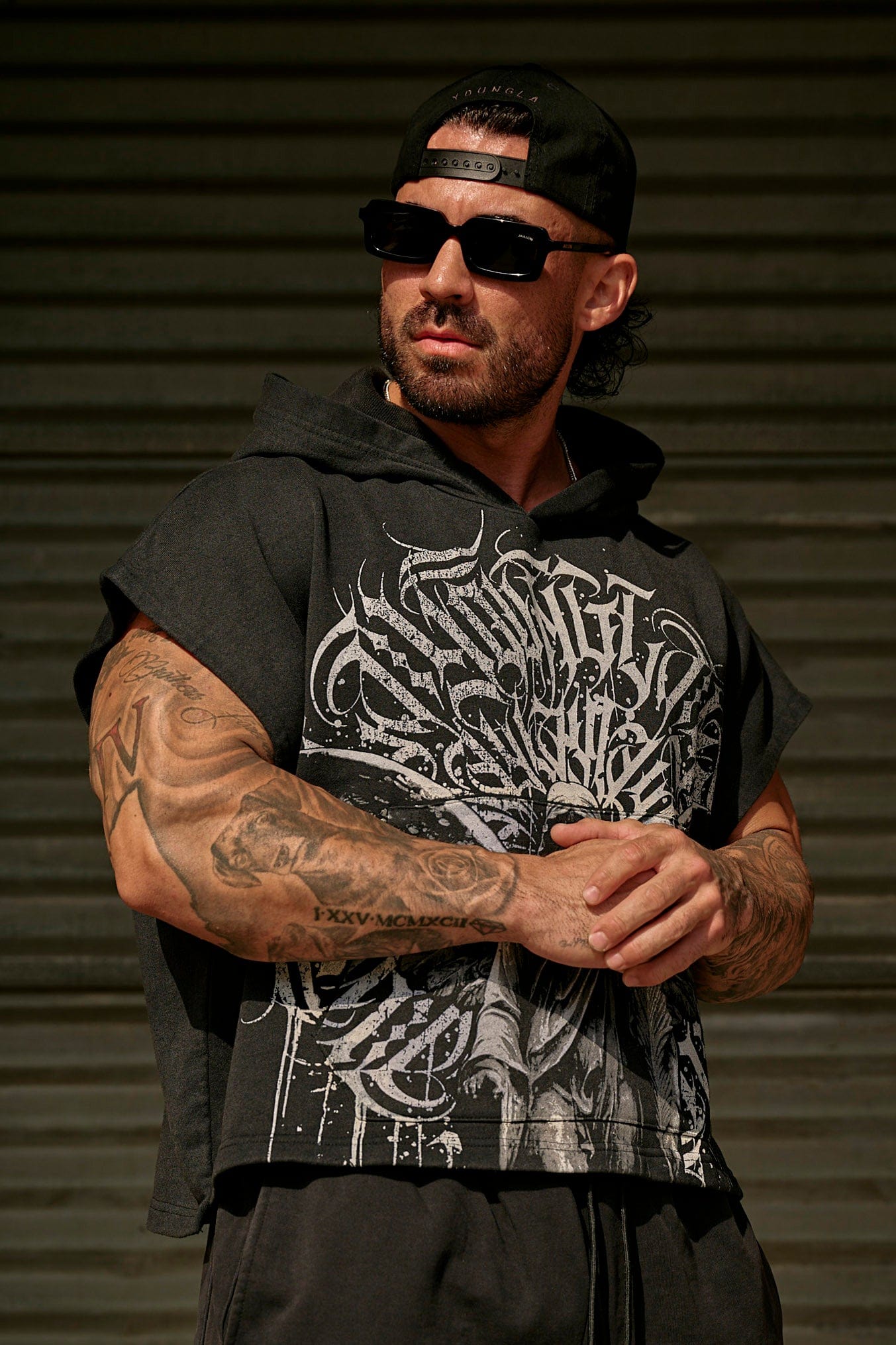DESIGN: Built with attitude, this cut-off hoodie features a bold front graphic, cap sleeves, and a roomy hood. The raw edges and gothic print deliver a gritty streetwear look made for standing out.