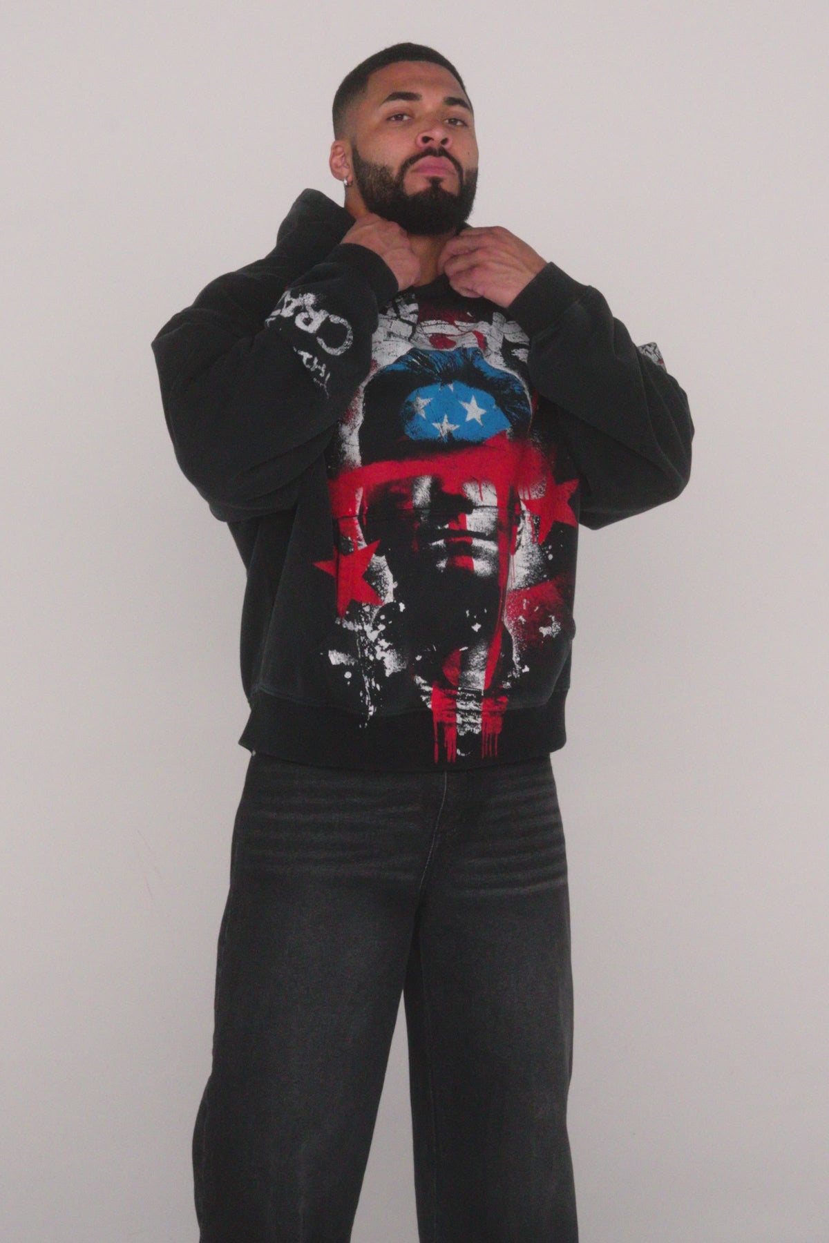 DESIGN: Not your average hoodie. This heavyweight 460 GSM pullover is built from 100% cotton and features a raw, distressed graphic from The Boys. Bold stars, slashed red paint strokes, and a rebellious aesthetic. Oversized, unapologetic, and ready for the streets.
