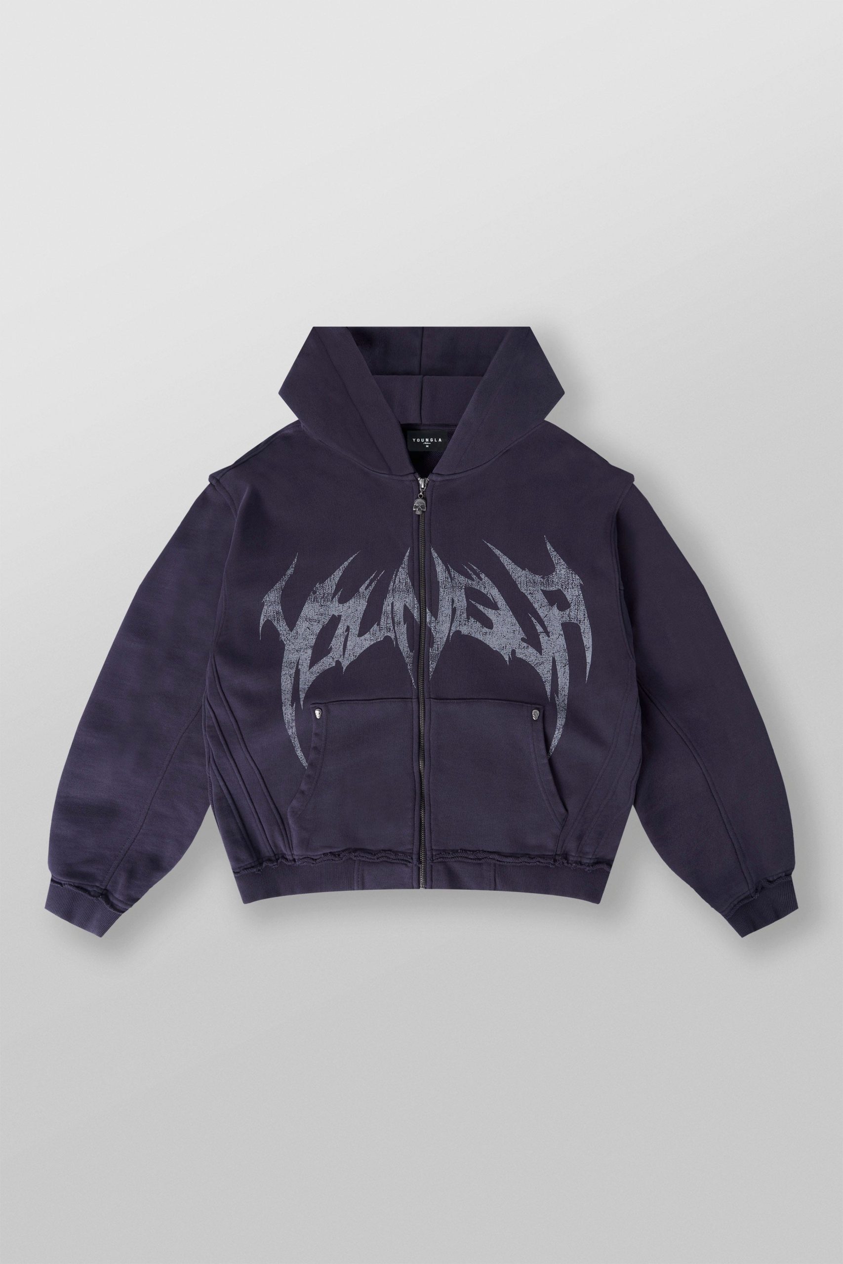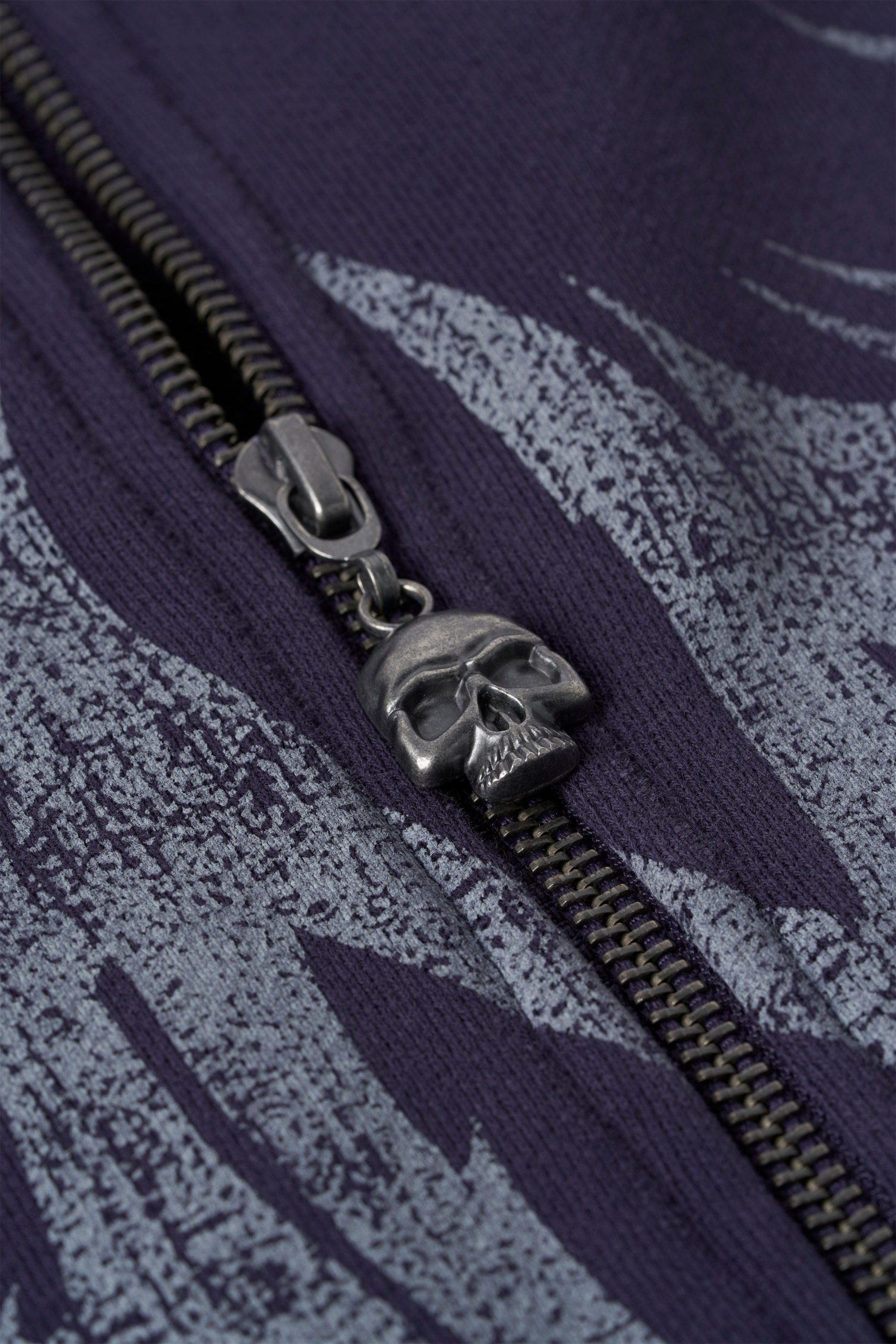 DESIGN: The Villain Hoodie is a statement piece with an edge. This zip-up hoodie features a distressed logo across the chest, skull-studded pocket corners and zipper puller, and exposed raw seams on the waistband and cuffs for a rebellious, worn-in look.