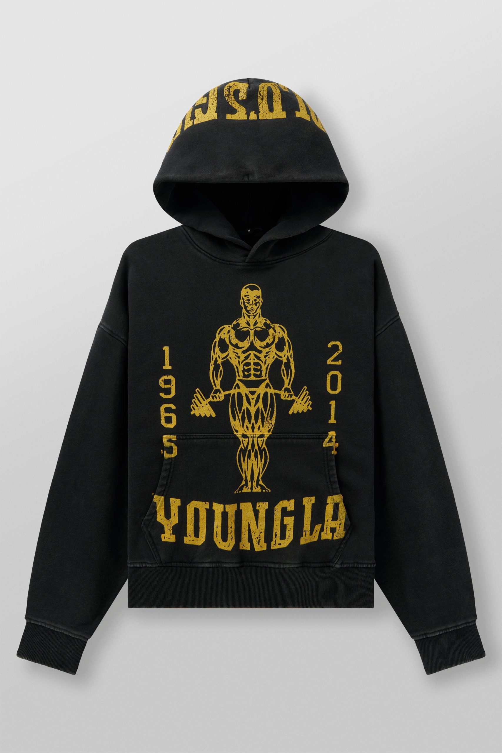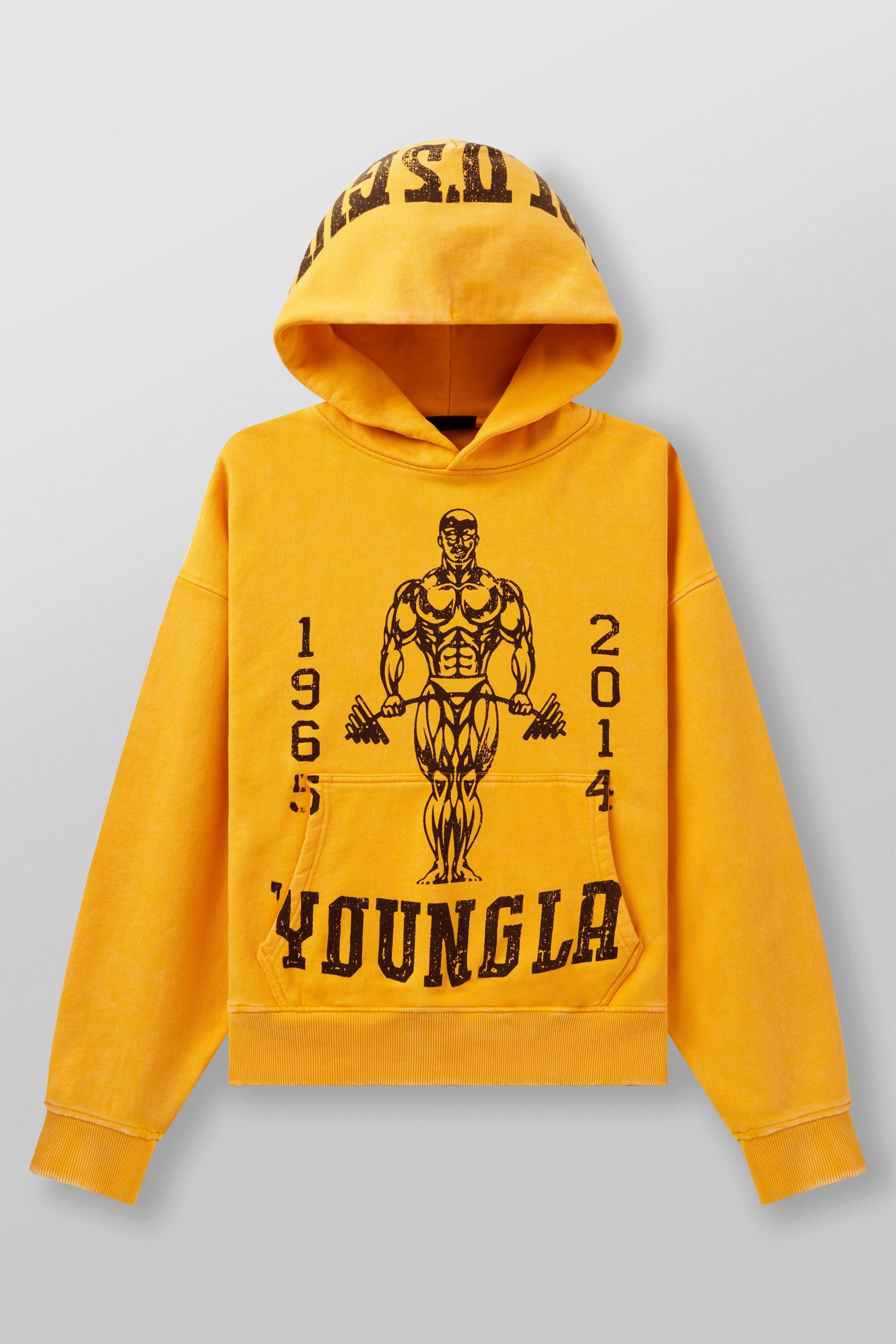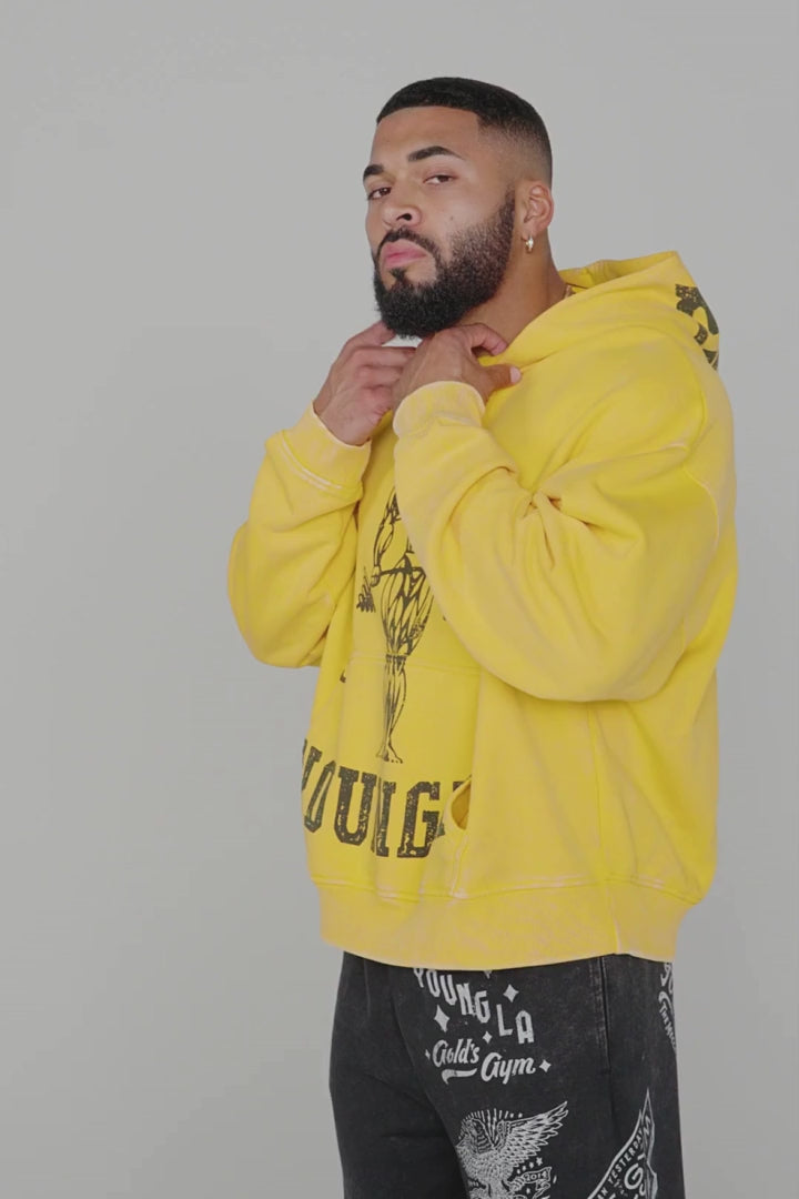 DESIGN: Make a statement with the YoungLA x Gold’s Gym hoodie—oversized for comfort, styled for impact. The distressed graphics and light acid wash bring an authentic vintage feel, while the classic yellow and black color options keep it timeless.