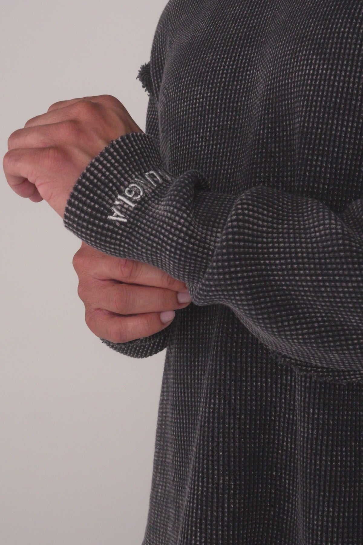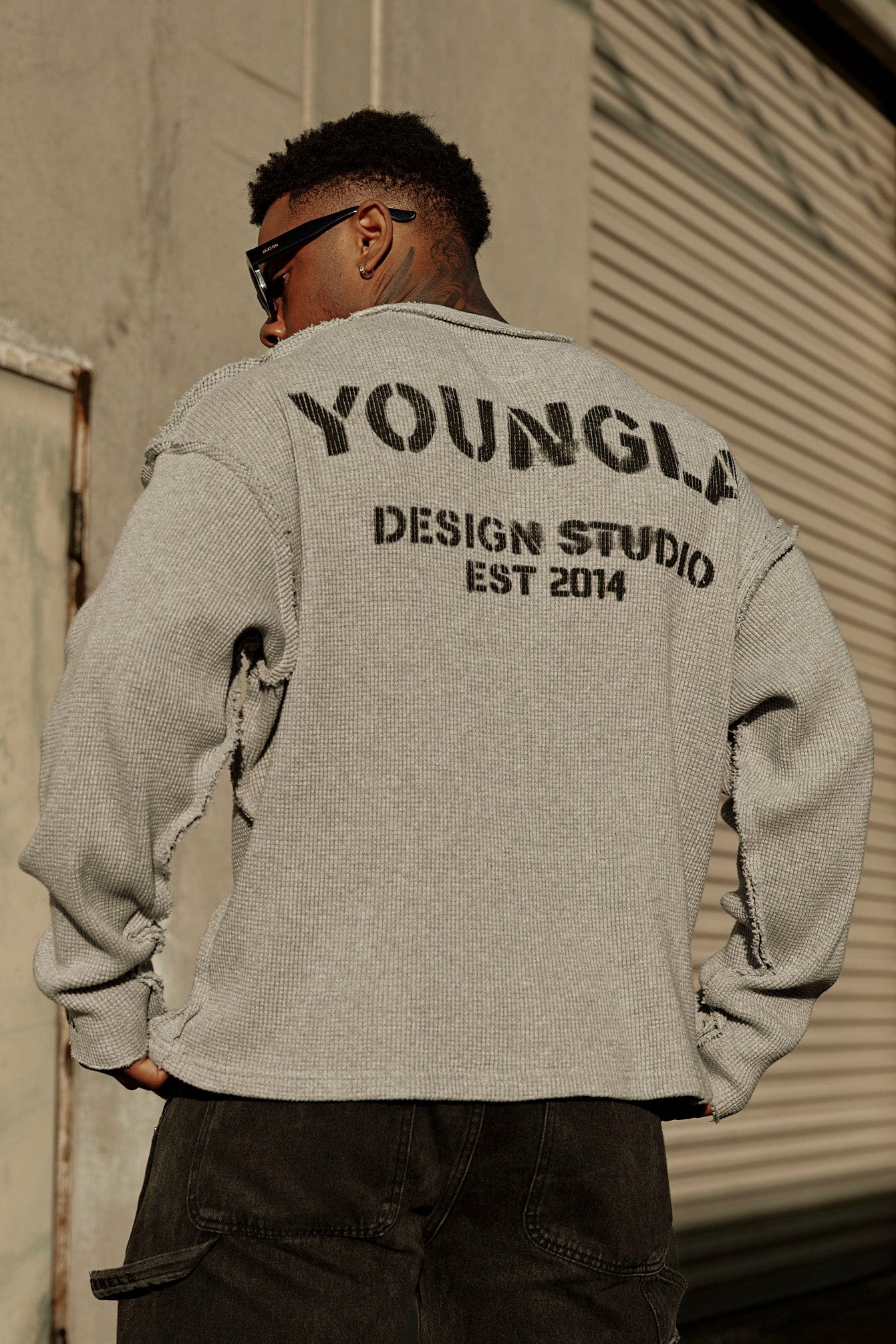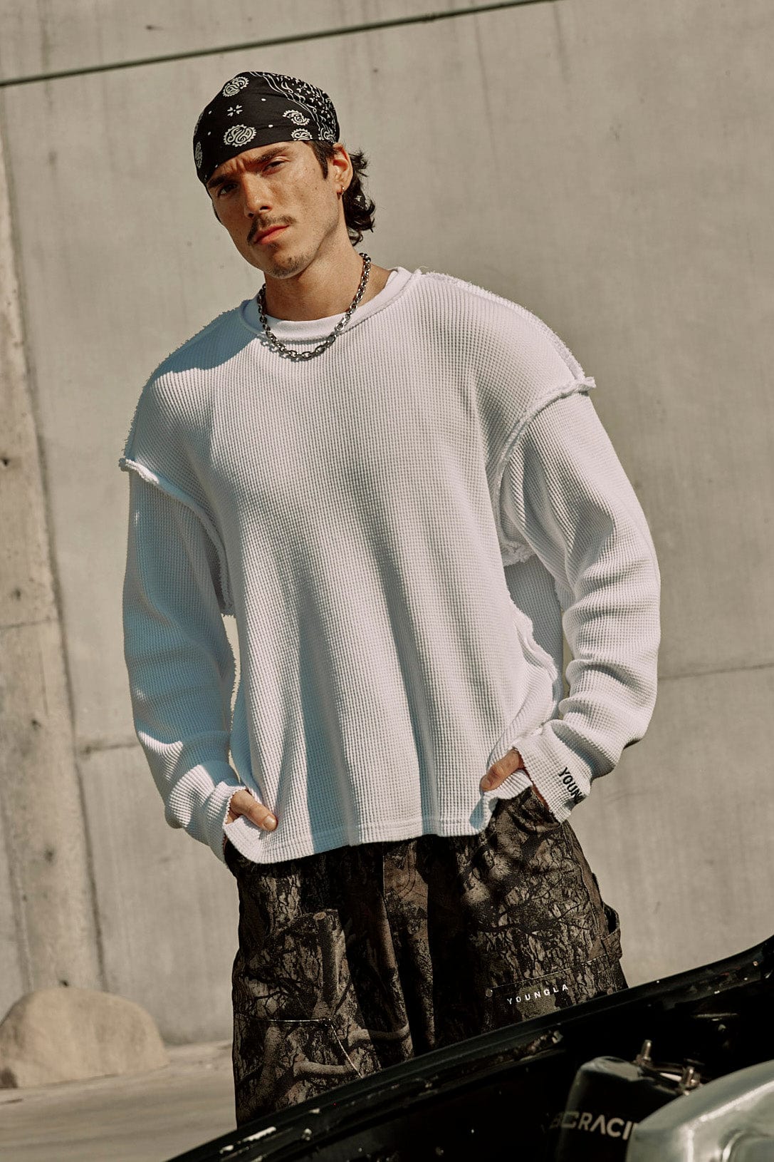 DESIGN: The Deconstructed Stencil Thermal Longsleeve is a bold fusion of rugged design and vintage aesthetics. Crafted from 100% cotton with a heavyweight 420 GSM fabric, this piece offers both warmth and durability. The washed fabric treatment gives it a naturally worn-in, vintage look, while the raw, exposed seams add to its deconstructed, unfinished appeal.