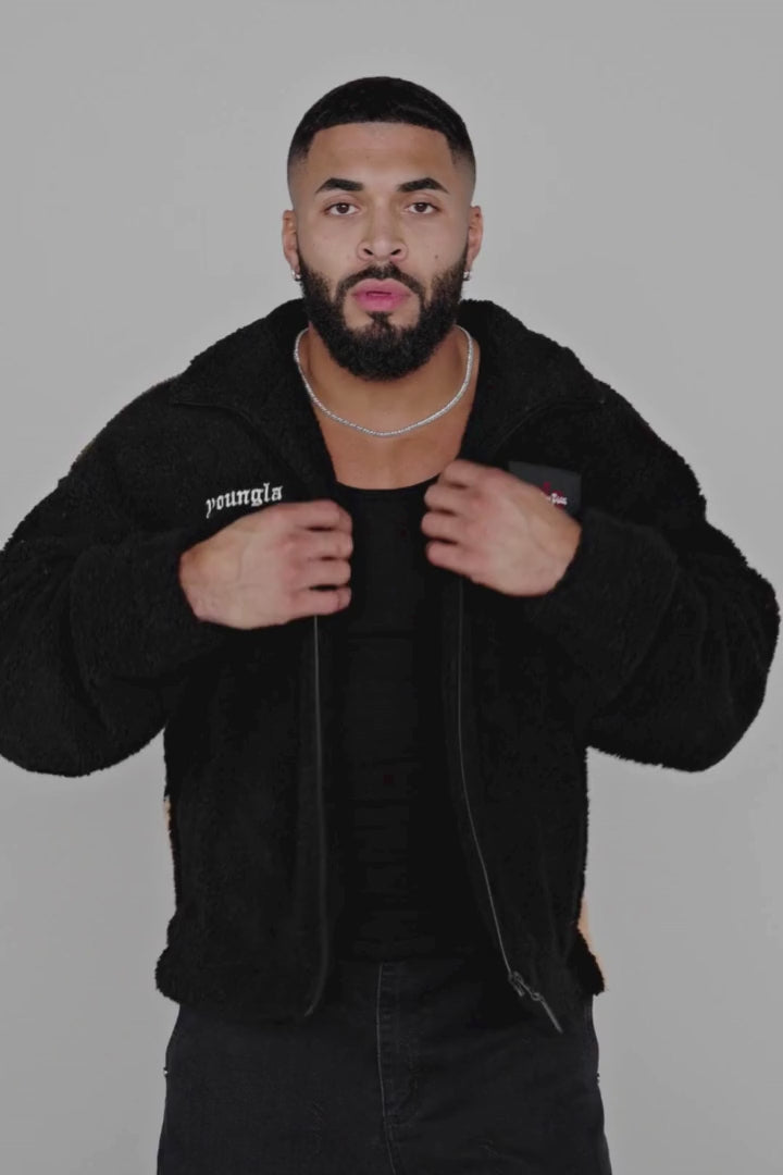 DESIGN: The YoungLA x Attack on Titan Sherpa Jacket is the perfect blend of style and comfort. Made with plush sherpa fabric, this zip-up winter essential features bold AOT graphics on the back, bringing your favorite series to life in a cozy design.