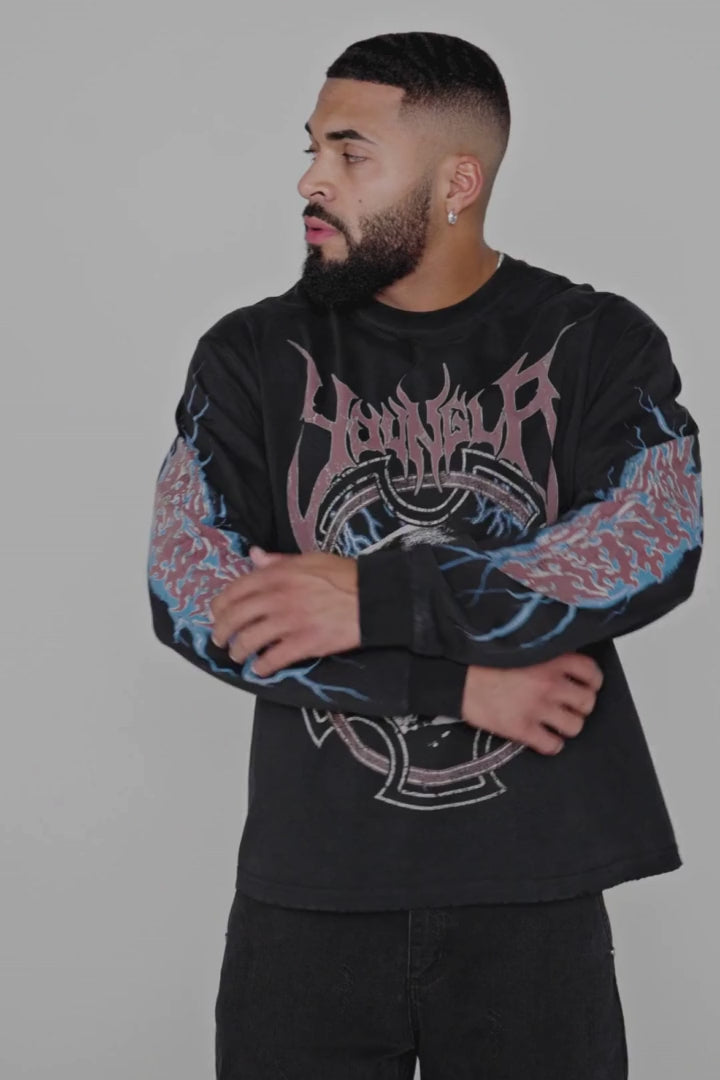 DESIGN: The Outcast Long sleeves feature striking distressed graphics on the chest and sleeves, creating a bold, grungy aesthetic. The relaxed fit makes it a versatile piece for casual wear with an unmistakable edge.